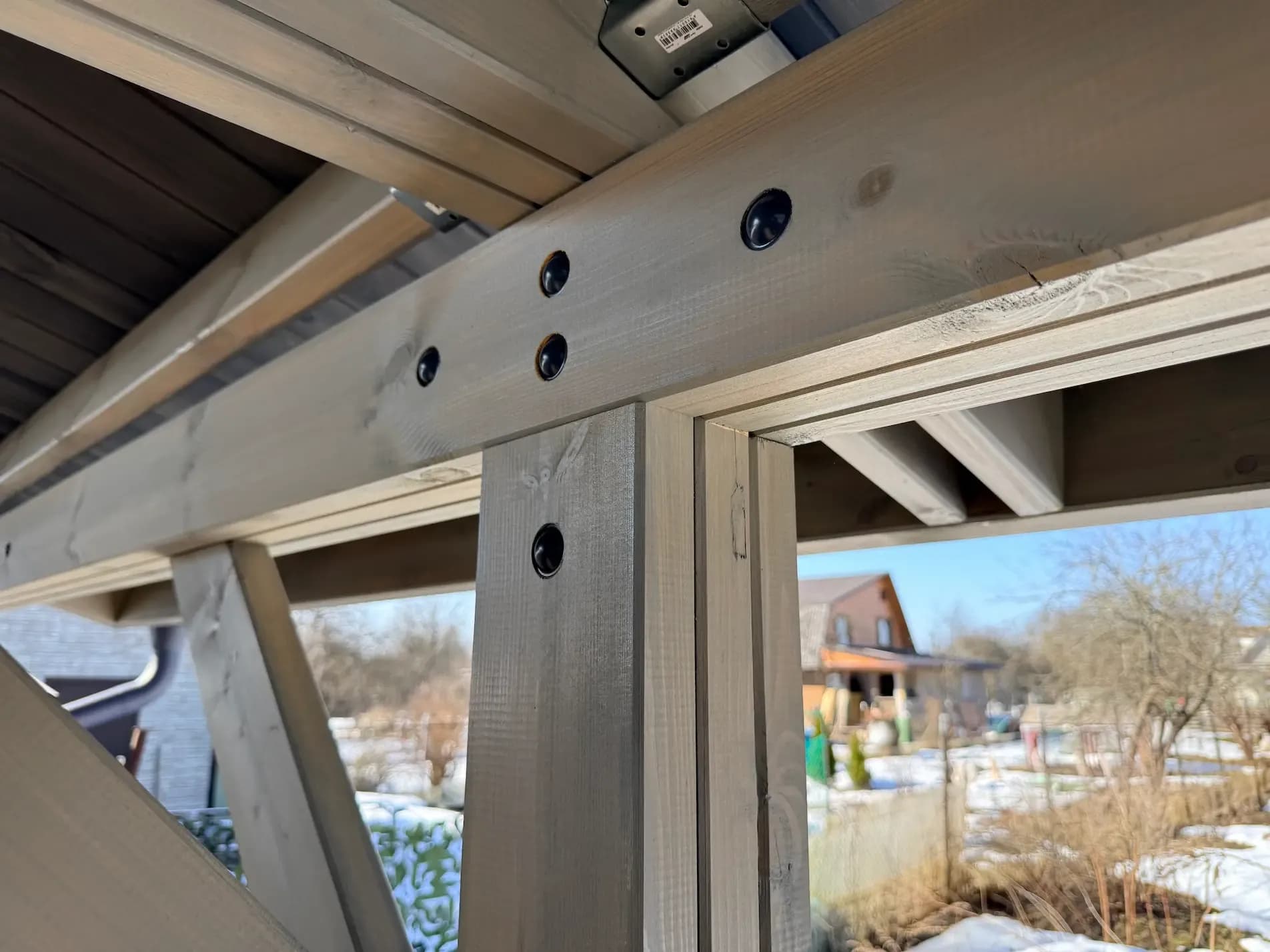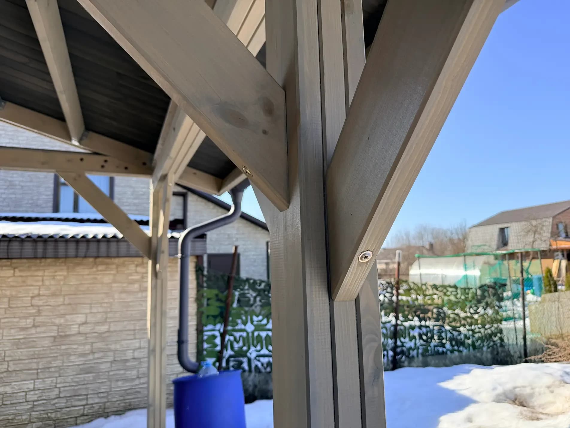 Такой подход дает и прочность, и более аккуратную архитектуру — навес выглядит собранно, а не грубо